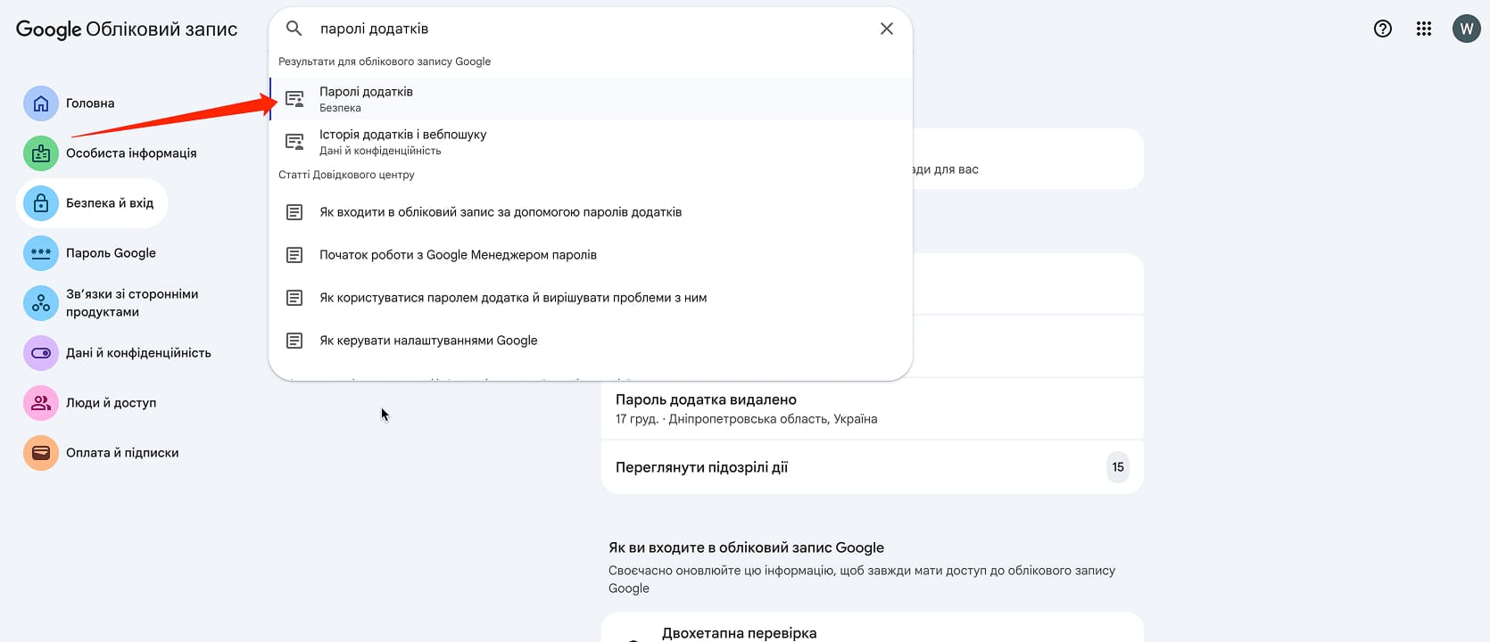 - На главной странице аккаунта Google в поле поиска введите «Пароли приложений» и перейдите к соответствующему разделу.